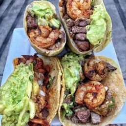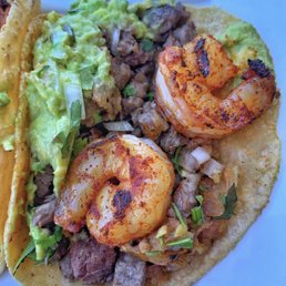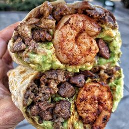 went on a thursday for dinner and it wasn't crowded. they have some indoor and outdoor seating. order at the counter and seat yourself, they also have a water station. don't forget to check in for the 10% discount before ordering, and they have complimentary aqua fresca on purchases over $15 on mondays - complimentary chips+salsa! the chips were good and lightly dusted in a powder that hits you in the back of the throat, but it's a light spice. - mar y tierra burrito (4/5): this was good! a little smaller than expected, but filling since the guacamole, sauce, and steak made it kind of heavy. they were generous with the guac and the steak had a nice charred flavor to it. the sauce was creamy and buttery and although there was less shrimp than steak, it was well seasoned. overall a pretty good burrito, although pricey overall, a little pricey and not traditional (if that's what you're looking for), but the food was good! i'd come back again